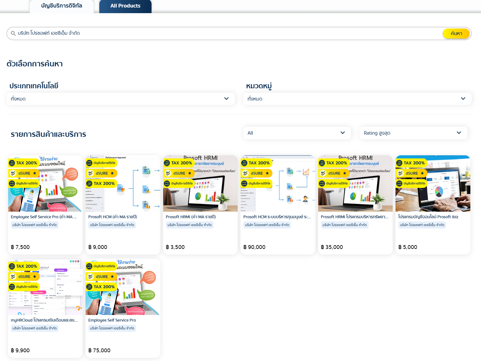 เข้าที่ https://techhunt.depa.or.thค้นหาชื่อ บริษัท โปรซอฟท์ เอชซีเอ็ม จำกัด เพื่อเลือกดูสินค้าที่ขึ้นทะเบียน