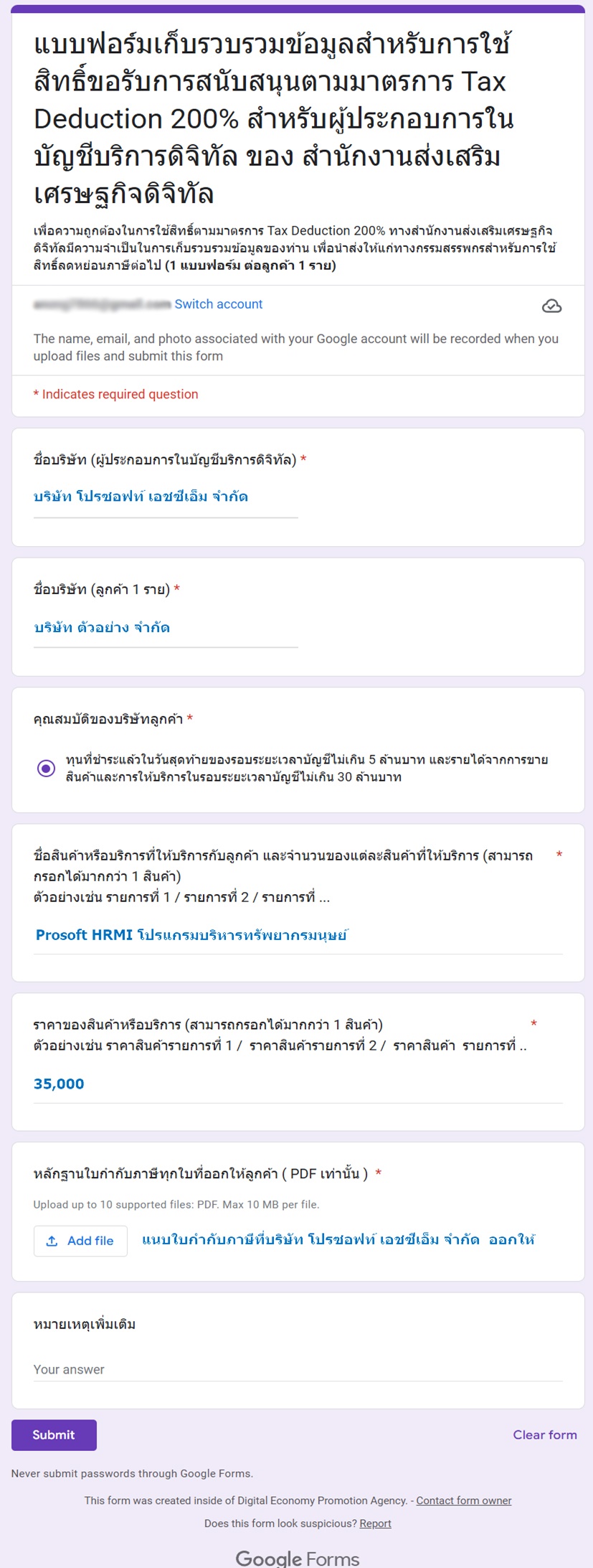 ตัวอย่างรายละเอียดที่ระบุในแบบฟอร์ม บริษัท ตัวอย่าง จำกัด ซื้อโปรแกรม “Prosoft HRMI โปรแกรมบริหารทรัพยากรมนุษย์” จากบริษัท โปรซอฟท์ เอชซีเอ็ม จำกัด