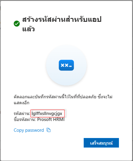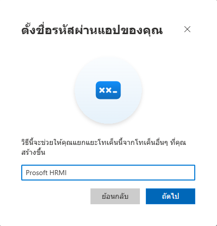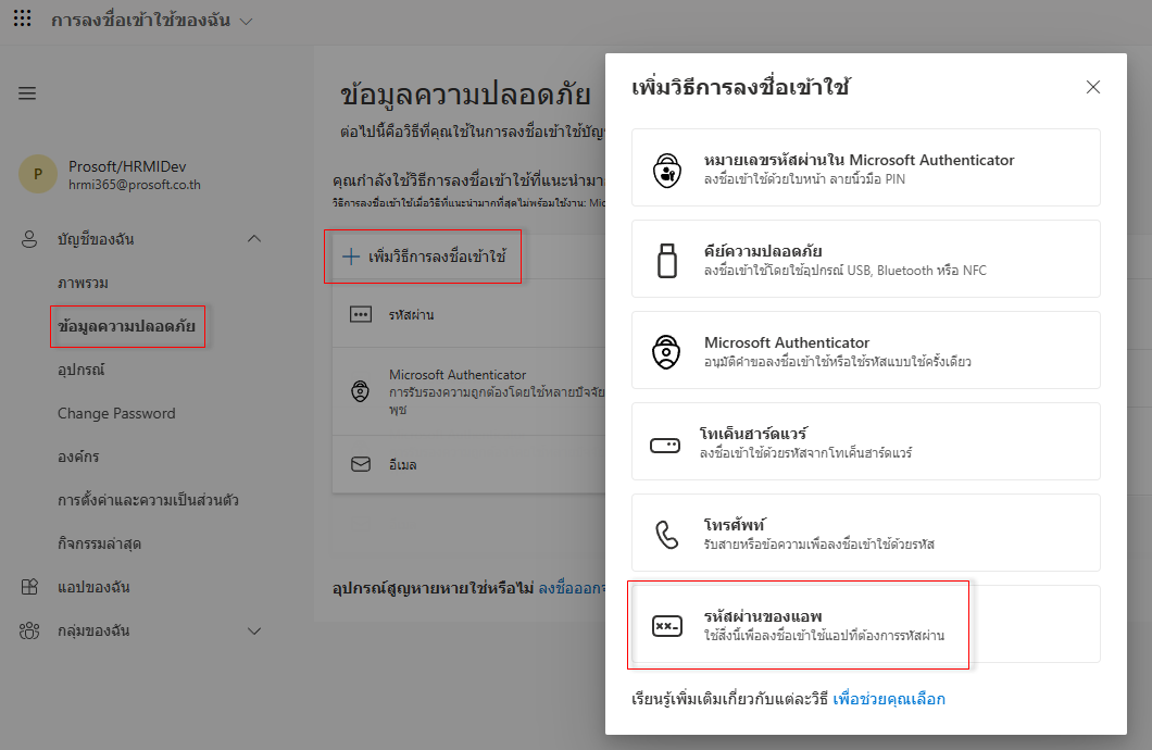 > ข้อมูลความปลอดภัย > เพิ่มวิธีการลงชื่อเข้าใช้ > รหัสผ่านของแอพ