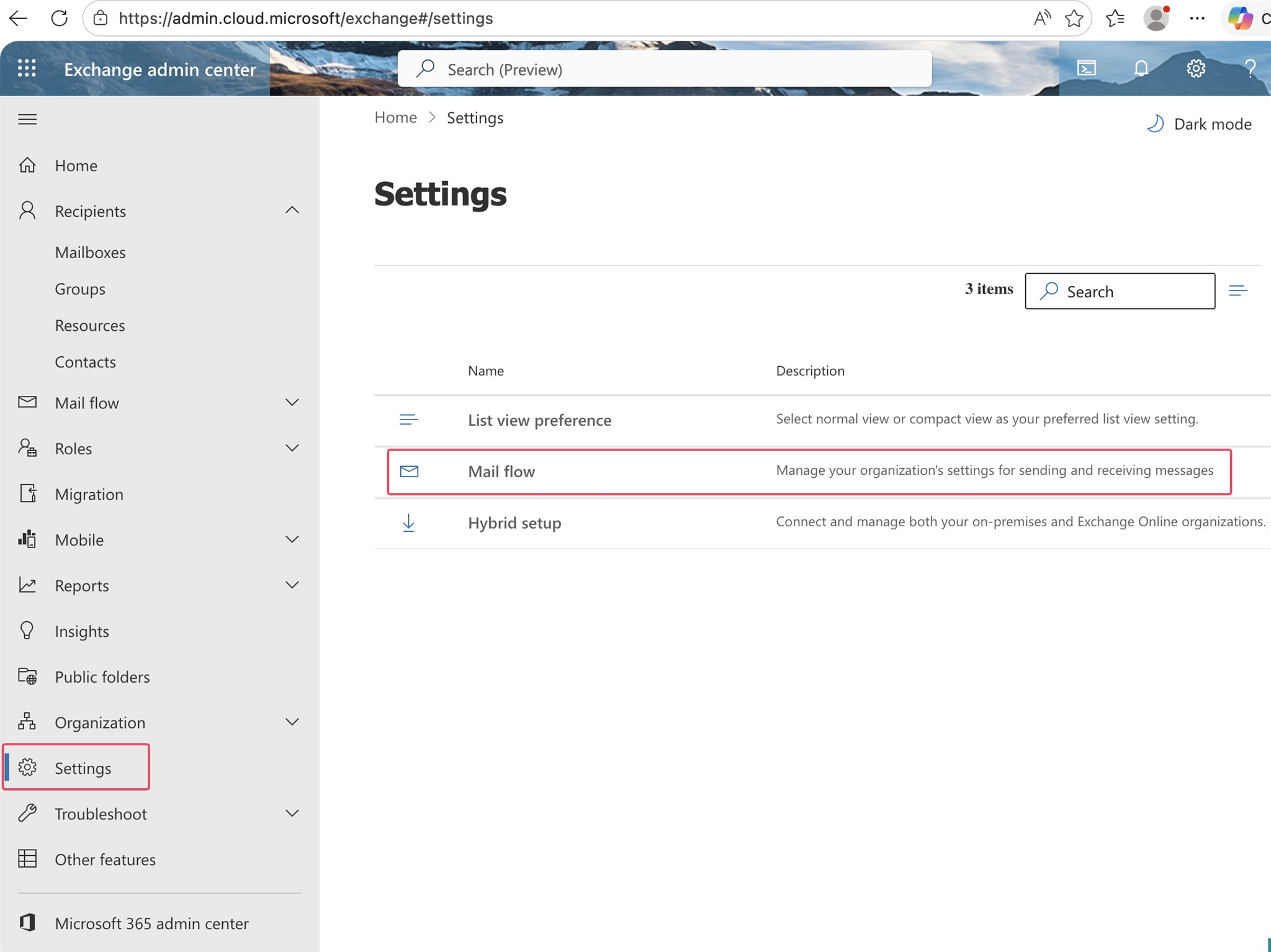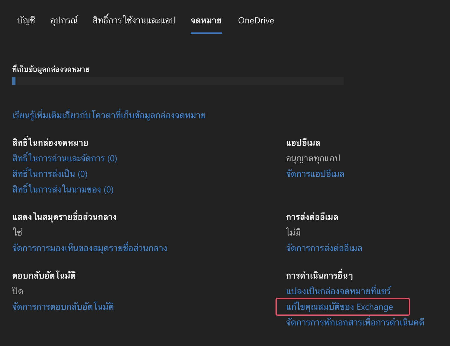 จดหมาย > แก้ไขคุณสมบัติของ Exchange > Exchange Admin Center > Settings > Mail Flow