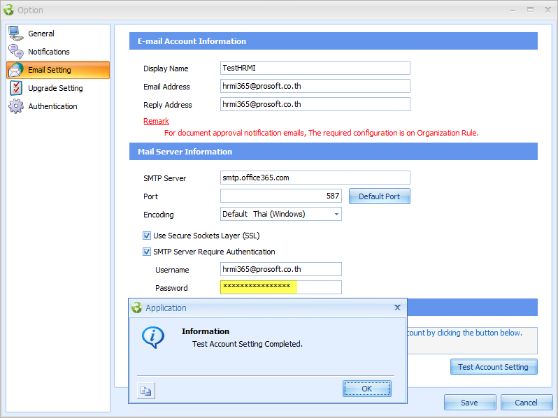 เนื่องด้วย Microsoft มีการเพิ่มระดับความปลอดภัยในการยืนยันตัวตน  ส่งผลให้ไม่สามารถใช้รหัสผ่านอีเมลปกติในการส่ง SMTP ผ่านแอปพลิเคชันภายนอกได้  จึงจำเป็นต้องดำเนินการตั้งค่าตามขั้นตอนดังต่อไปนี้  เพื่อให้ระบบ HRMI สามารถส่งอีเมลแจ้งเตือนได้ตามปกติ